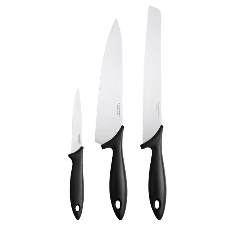 Essential Starter sett inneholder tre kniver: skrellekniv/grønnsakskniv, kokkekniv og en brødkniv. Alle knivene har solid rustfritt stålblad og et robust, slitesterkt PP-håndtak med fingerstopp for sikker bruk.