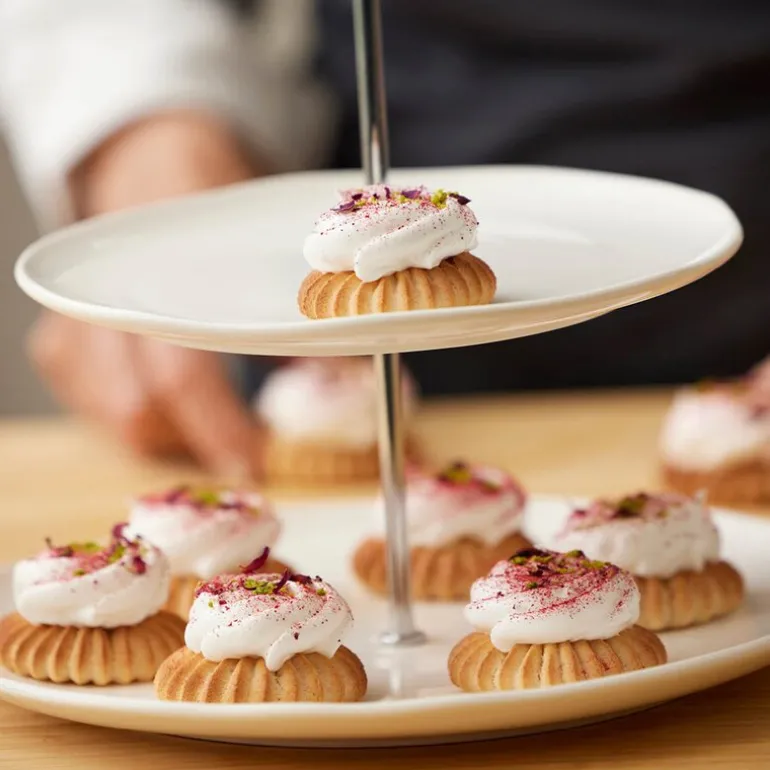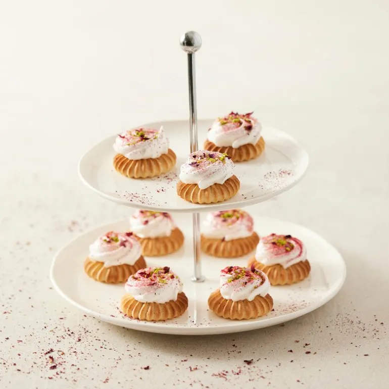 Blomsterbergs etasjefat i to lag, laget av hvitt porselen, er et elegant og tidløst serveringsfat som gir en sofistikert presentasjon av dine kreasjoner. Fatet er ideelt for å servere cupcakes, små desserter, utskåret frukt, fingermat, små smørbrød, oster eller bursdagsboller.
