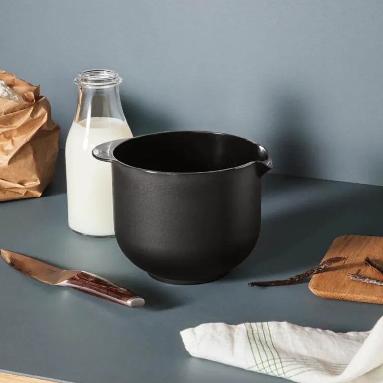 Det ergonomiske grepet gir et solid hold under bruk, mens helletuten gjør det enkelt å overføre innholdet til en serveringsskål eller mugge uten søl. En praktisk gummikant under bunnen sørger for at bollen står stabilt på kjøkkenbenken, selv ved kraftig røring.
