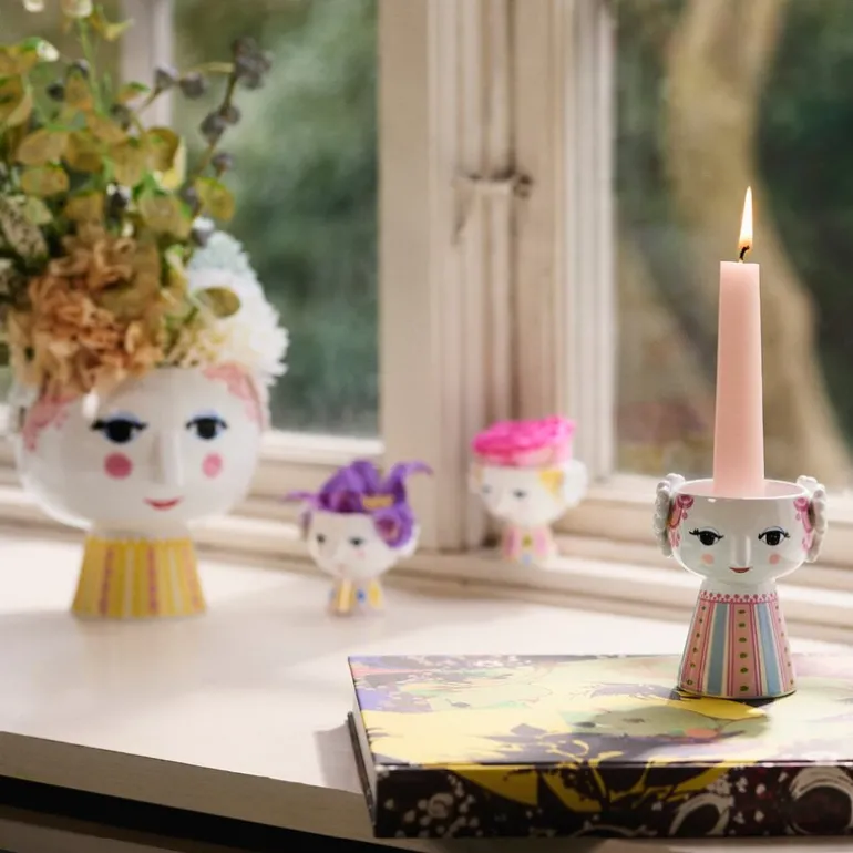 Utfold din fargerike personlighet og la kreativiteten skinne med Bjørn Wiinblads Eva lysestake 9,5 cm pink. Med sitt glade smil, blussende kinn og fargerike dekorasjoner rommer Eva på alle måter essensen av Bjørn Wiinblad som person og kunstner – også når hun tar form som lysestake. Glad og drømmende skaper hun liv og personlighet i innredningen med sitt poetiske uttrykk og sine sprudlende farger. Denne Eva-lysestaken er 9,5 cm høy og er primært rosa i kombinasjon med detaljer i lyseblått og grønt, noe som skaper et friskt og levende uttrykk. Når et tent lys plasseres i lysestaken, lyser den enda mer opp og gjør hverdagen litt mer fargerik.