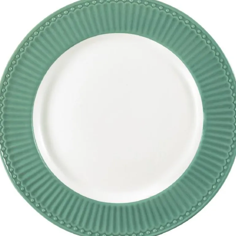 GreenGate Middagstallerkenen Alice Dusty Green er en stor tallerken er vakkert formet med fine detaljer som gir den et enkelt, søtt uttrykk. Lag ditt eget unike utseende ved å blande Hverdagsprodukter med våre klassiske design.