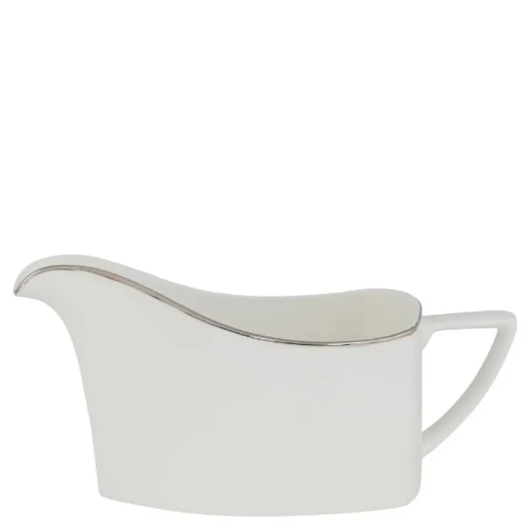 Sausenebb u/fat i serviset Extreme Platinum fra Royal Porcelain. Extreme Platinum er et moderne festservise for den som våger litt mer. Serien har et stramt, rent design med spennende former, alt kantet med sølv. Hvem sa at tallerkenen må være rund? De hvite tallerkenene kan fint kombineres med delene som heter Extreme Platinum Paris. Disse er dekorert med et lyst, delikat barokkmønster. Eller hva med å blande produkter fra Royal Porcelains Platinum-serie med Extreme Platinum?Serien er produsert av Royal Porcelain, en av Norges største merkevarer innen serviser. Extreme Platinum er laget av benporselen, som er den aller fineste type porselen. Serien er egnet for oppvaskmaskin. Extreme Platinum får du kun hos Tilbords. Extreme Platinum er et komplett festservise, som inneholder alt du trenger til den fine anledningen. Det enkle, tidløse designet gjør at serviset er like aktuell til alle årstider og kan kombineres med bordpynt i dine favorittfarger. Serien inneholder tallerkener i ulike størrelser – til forrett, hovedrett og dessert – serveringsfat i flere størrelser, suppeterrin, sausenebb og salatbolle. I tillegg finner du selvsagt et komplett kaffeservise.