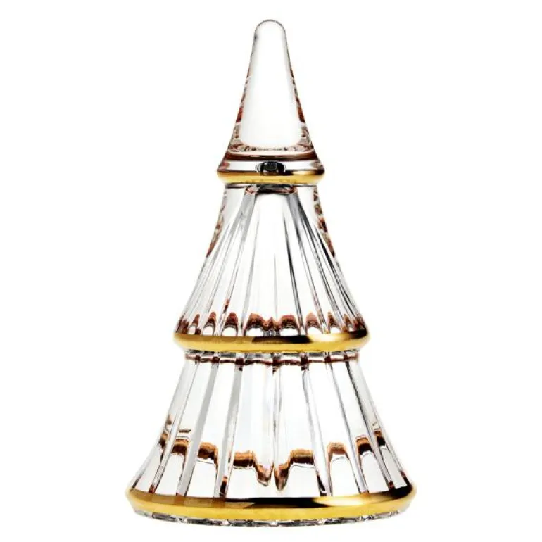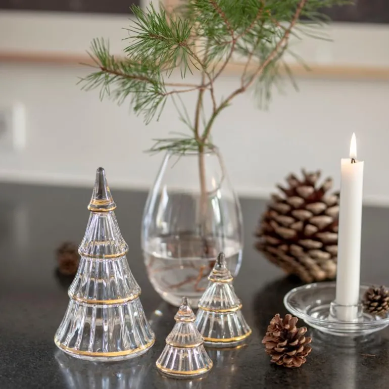 Dette Fairytales-juletreet i klart glass er uunnværlig i juletiden. Her får du et juletre i presset glass som er utsmykket med håndmalte gullstreker. Den fine kombinasjonen av glass og gull er perfekt til julebordets utsmykning, og dette juletreet kan lett kombineres med de andre størrelsene i samme serie. Juletreet måler 14 cm i høyden og har likeledes en bredde på 8 cm. Treet kan plasseres både i vinduskarmen, på sofabordet og på det store middagsbordet som en del av pynten. Med den enkle designen komplementerer dette juletreet også andre juleserier fra Holmegaard, og det er bare opp til deg å finne frem til din foretrukne kombinasjon.