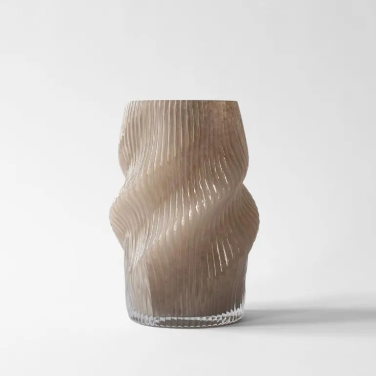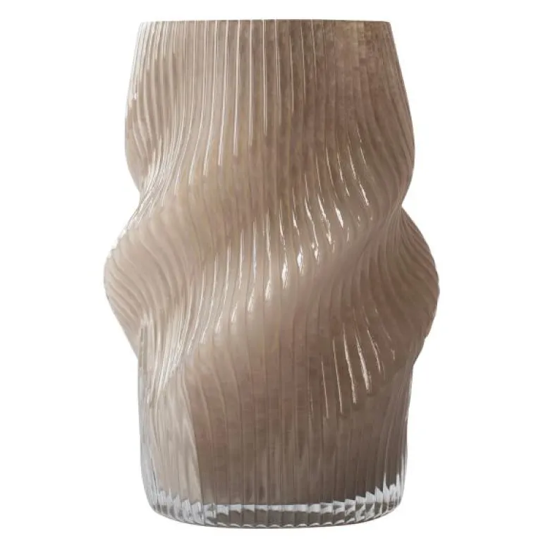 Fano vase 25 cm taupe fra Tell Me More. Dekorativ glassvase med feiende form for alle hjemmets rom. Den munnblåste vasen har en gråbrun tone med vakre variasjoner i glasset som gjør den både levende og unik. Fano vase er laget for hånd, noe som betyr at hver vase er unik, farge og form kan avvike litt fra bildene.