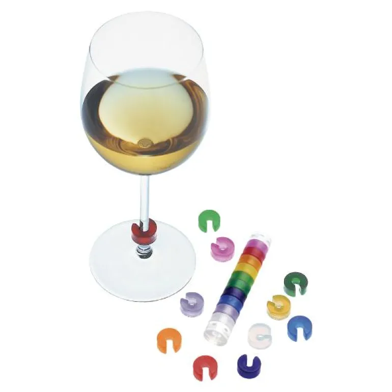 Morsomme og fine fargekoder som festes rundt stetten på vinglasset, slik at alle på festen kan kjenne igjen glasset sitt.