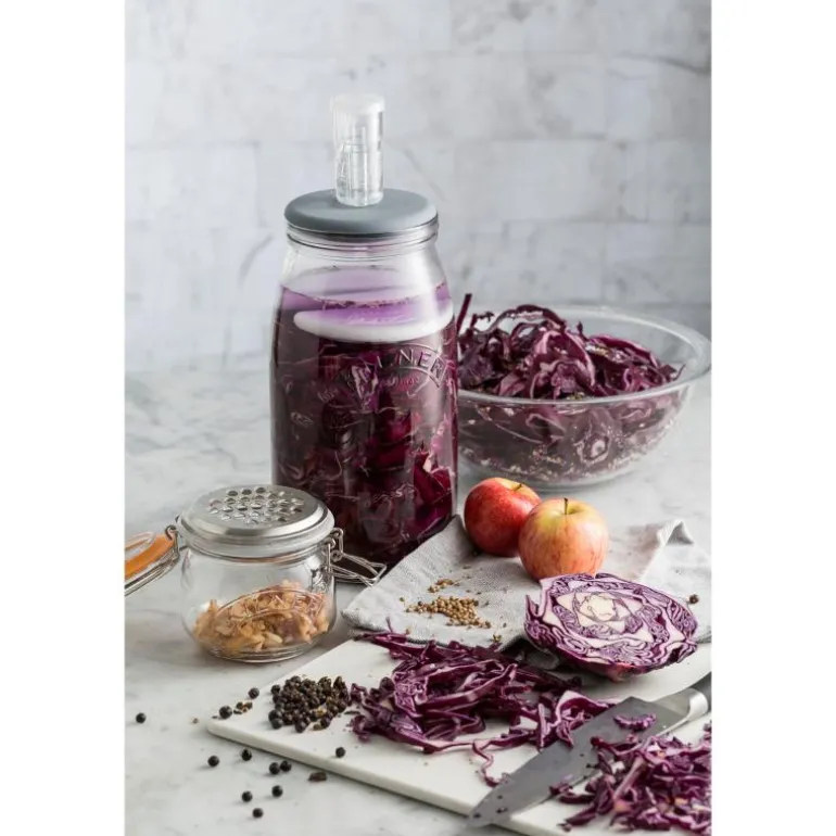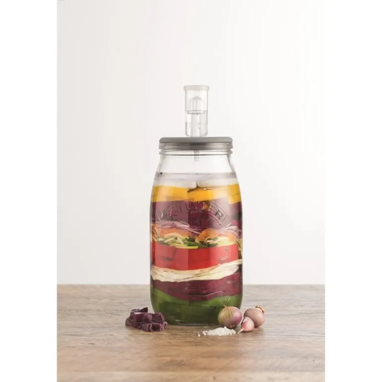 Fermentering (melkesyrefermentering) av dagligvarer har blitt svært populært. Kimchi, sure agurker og surkålretter er stadig mer etterspurt. Fermenteringsprosessen varierer avhengig av oppskriften, men som hovedregel tar surkål ca. 3 uker og kimchi bare noen få dager. Dette fermenteringssettet består av en 3-liters glassbeholder, et tetningslokk i silikongummi, 2 keramiske vekter som sikrer at fermenteringsmassen holder seg under overflaten, og en vannlås som forhindrer at uønskede mikroorganismer forstyrrer prosessen. Kort sagt alt du trenger (utover råvarer) for gode resultater.