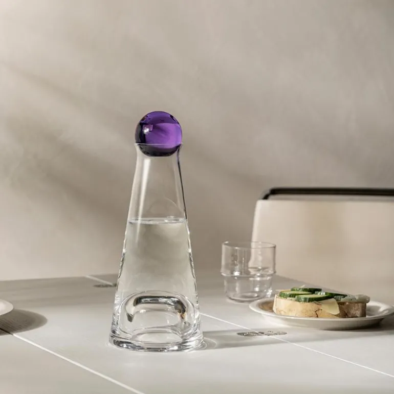 Karaffel, Fia 100 cl i fargen amethyst, fra Design House Stockholm. Vin. Vann. Olje. Eddik. Uunnværlig på ethvert bord, og alltid i behov av en skikkelig presentasjon. Designet av Nina Jobs og produsert av Design House Stockholm, fremhever Fia karaffel innholdet med munnblåst glass og fargerik glasskuletopp.