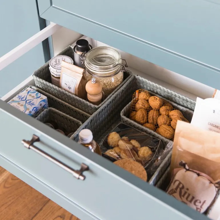 Den håndflettede kurven er laget av resirkulert plast og har et delikat flettemønster som gir et raffinert uttrykk. Passer perfekt til badet, kjøkkenet, kontoret eller stua – og gir deg enkel oversikt over småting i skap og skuffer. En praktisk løsning med stilrent design.