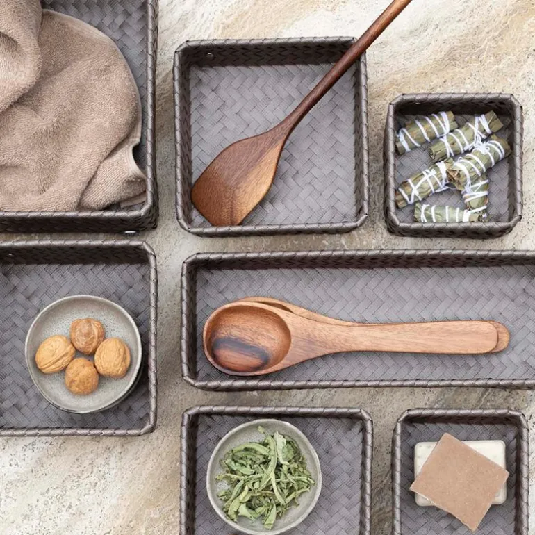 Den håndflettede kurven er laget av resirkulert plast og har et delikat flettemønster som gir et raffinert uttrykk. Passer perfekt til badet, kjøkkenet, kontoret eller stua – og gir deg enkel oversikt over småting i skap og skuffer. En praktisk løsning med stilrent design.