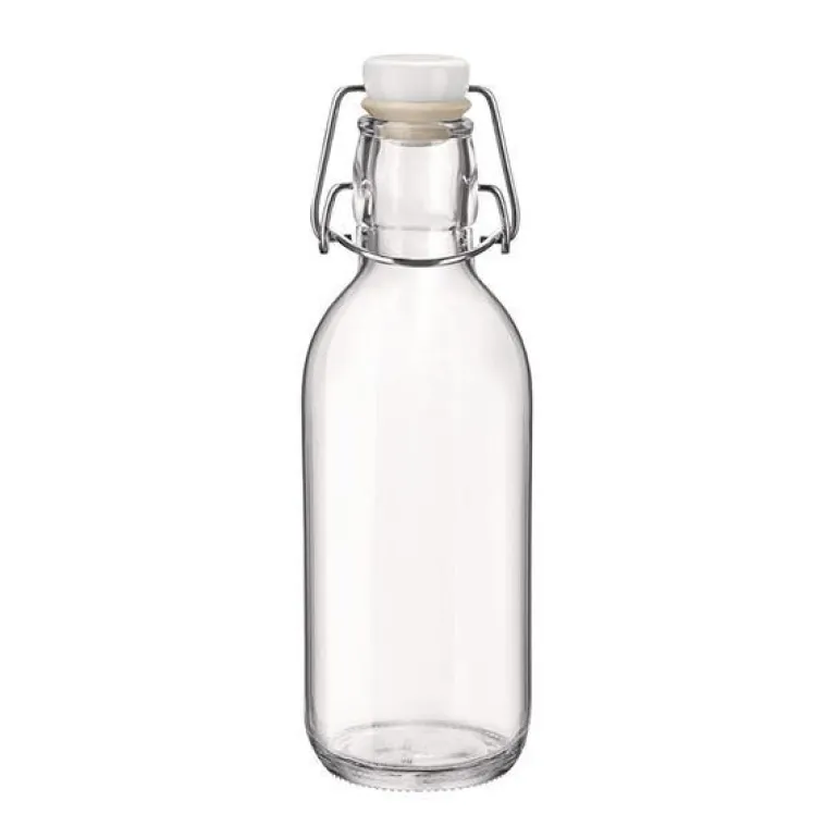 Vakuumtett glassflaske med patentkork til servering eller safting av sesongens råvarer. Måler dia 7 cm høyde 21 cm 0,5 l. Flasken kan steriliseres men det er viktig at den ikke utsettes for temperatursjokk. Gradvis oppvarming til 100 °C i 10 min. Vi anbefaler håndvask, gjerne med en flaskebørste.