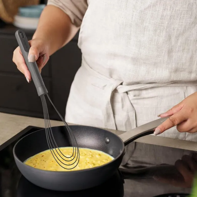 Grå flatvisp med silikon 30 cm fra Zyliss. Flatvispen er spesielt egnet for å vispe væsker i grunne panner. Den har et trådhode med silikonbelegg. Dette betyr at den kan brukes sammen i non-stick kokekar.
