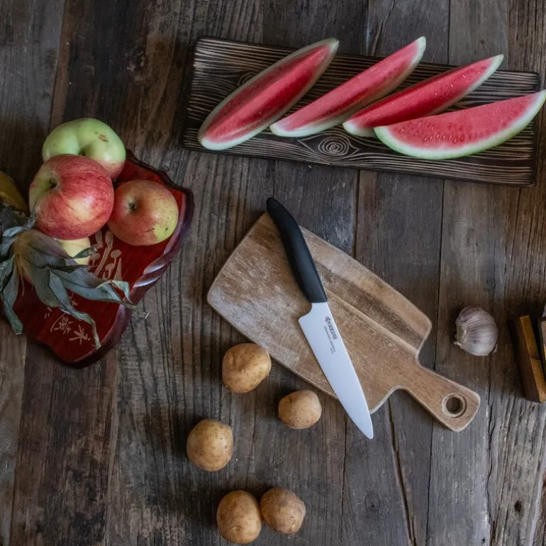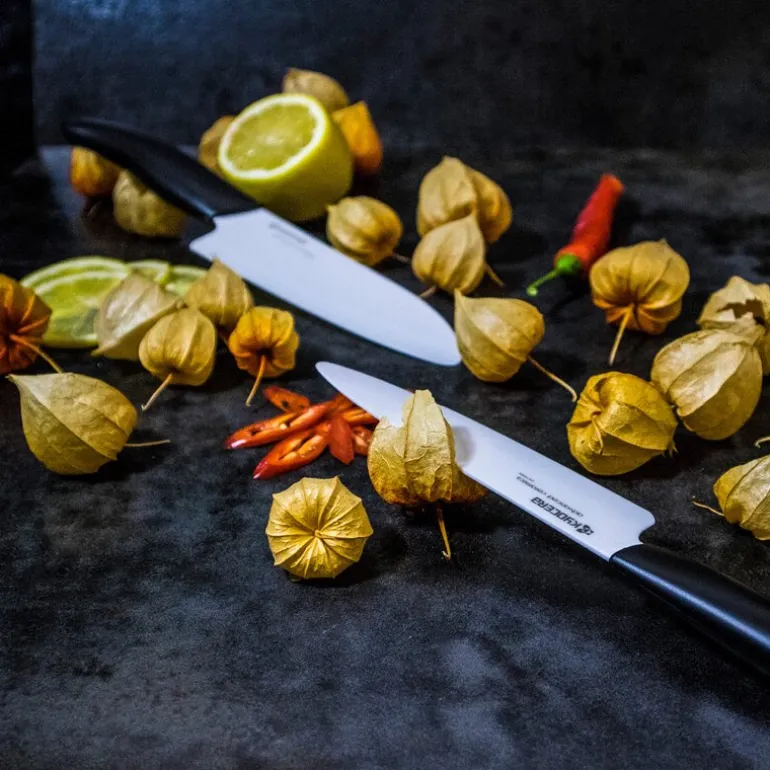 Keramisk allroundkniv med sort håndtak. Keramikk er verdens hardeste materiale etter diamant. Knivskarp i dag, i morgen og i lang tid fremover. Men når bladet skal slipes er det enkelt med en diamantkant. Kniven ruster ikke og er ikke påvirket av syrer.