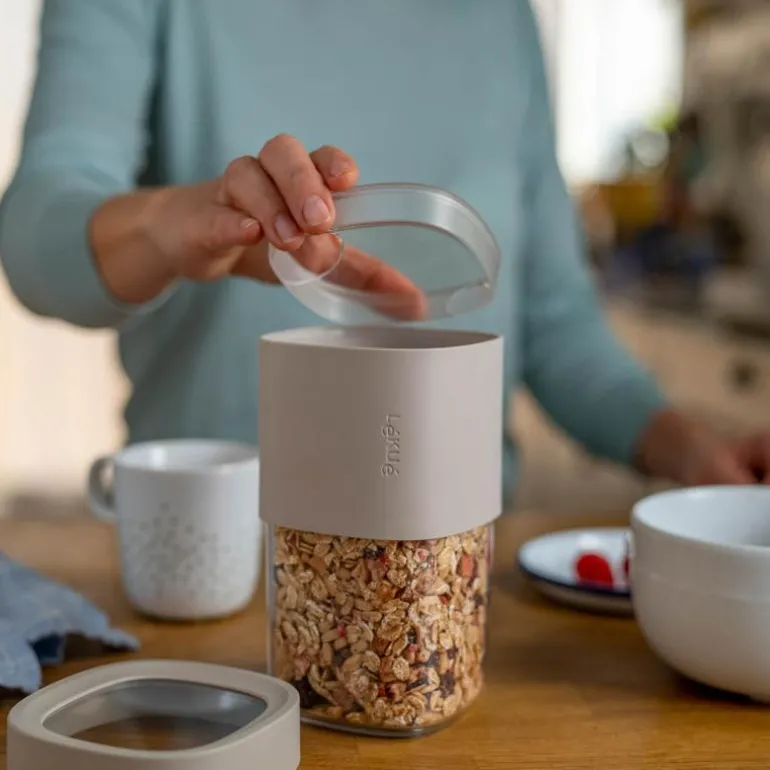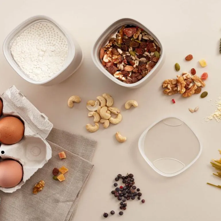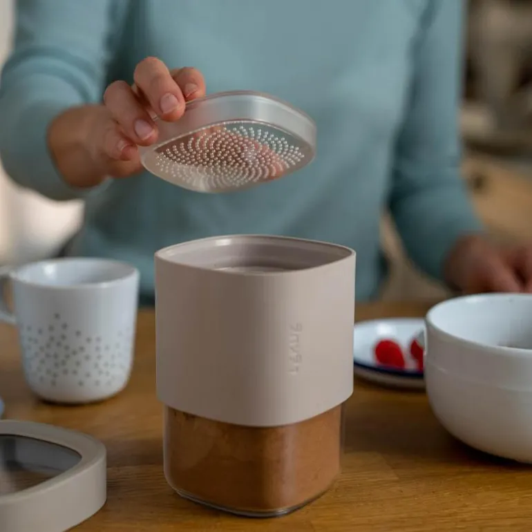 Tilbehør til Lékué oppbevaringsbokser. Utover enkel lagring, inkluderer 2 Flip Storage-tilbehør for å tømme matlagringsbeholderne dine enklere; et sile-lokk, perfekt for pulvervarer som kakao og mel, med en leppe i ett hjørne for enklere håndtering, samt et lokk med to åpninger (en for større ingredienser, en mindre) som passer til et bredere spekter av matvarer.