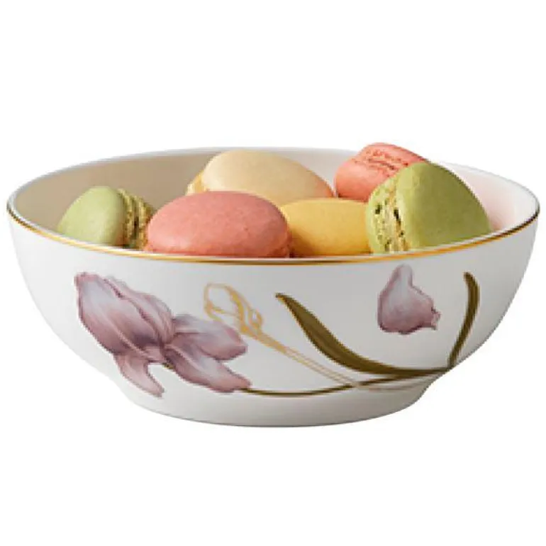 Flora bærer vakkert arven fra Flora Danicas historiske blomstermotiver med seg inn i fremtiden. Hver servisedel er prydet med en vakker blomst; like frisk som en nyplukket blomst fra Danmarks hager. Designet i 2012 av Anja Kragh Vang. En yndig iris er avbildet i rosa og gylne nyanser på denne vakre Flora-skålen. Skålen har et enkelt design, som lar de vakre blomstene stå i sentrum på skålens overflate i kombinasjon med en diskret gullkant. Den lille skålen på 50 cl er en perfekt serveringsskål til snacks og småretter. Kan vaskes i oppvaskmaskin.