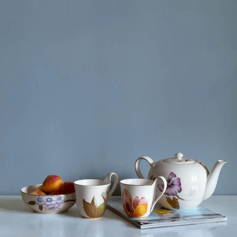 Flora bærer vakkert arven fra Flora Danicas historiske blomstermotiver med seg inn i fremtiden. Hver servisedel er prydet med en vakker blomst; like frisk som en nyplukket blomst fra Danmarks hager. Designet i 2012 av Anja Kragh Vang. Med blomster i lilla nyanser og tunge blader snor snerlen seg rundt Flora tekannen. På kannens ene side blir håndverket og designet bak dekorasjonen avduket med sirlige streker og enkle detaljer, som fungerer som en vakker kontrast til de frodige blomstene. Tekannen rommer 130 cl av din favoritt-te. Kan vaskes i oppvaskmaskin.