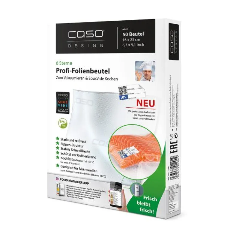 Caso Folieposer 16cm x 23cm, 50 stk. Poser til at vakuumere madvarer, der kan fryses, anvendes i forbindelse med Sous Vide madlavning, tåler både mikrobølgeovn og kogende vand. Materialet i posene er sterkt med struktur og tykkelsen er ca. 150 min.