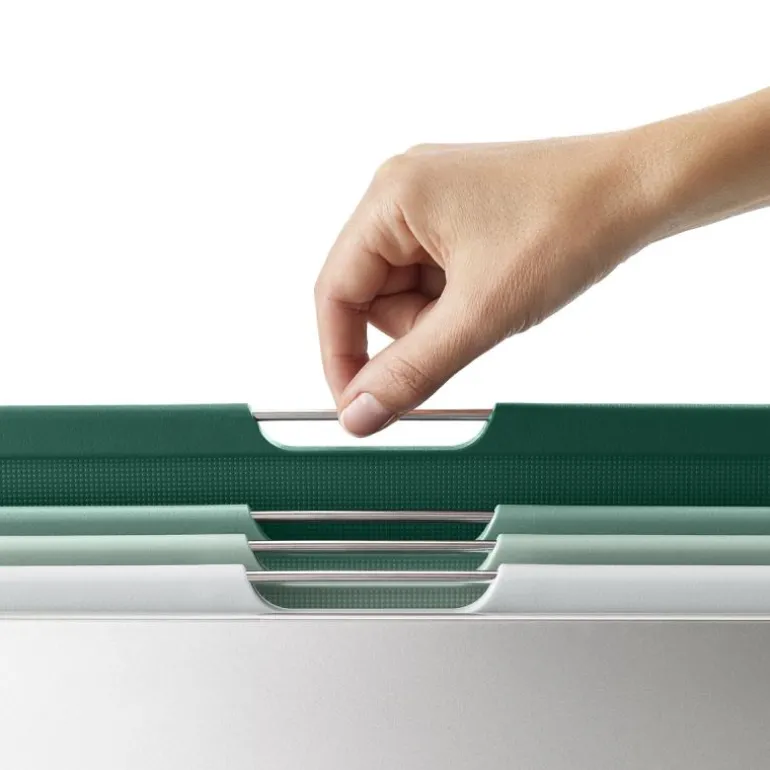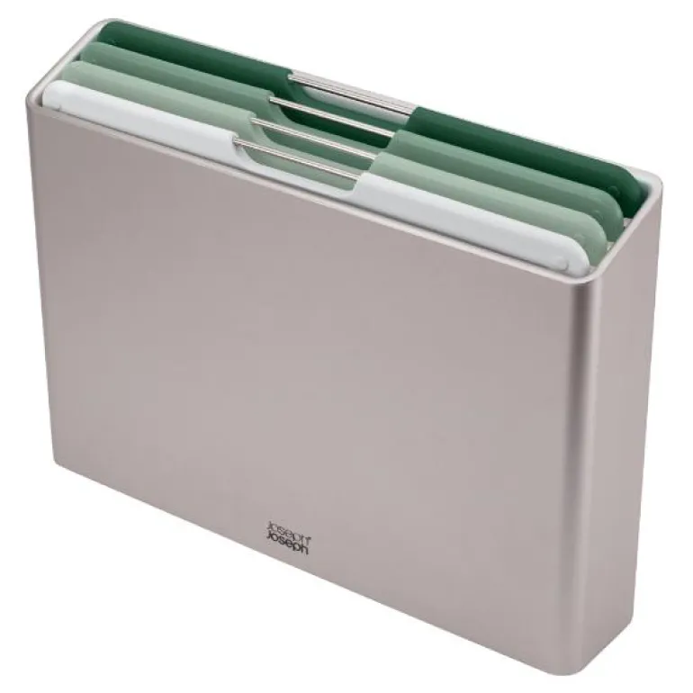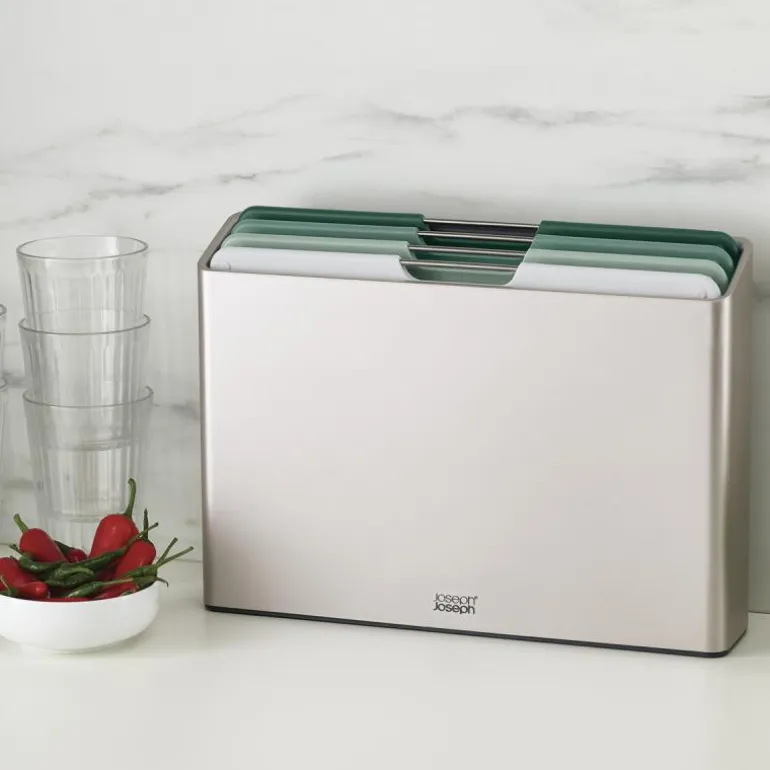 Joseph Josephs Folio Sage skjærebrett i fargekoder er den ultimate løsningen for å organisere matlagingen og holde kjøkkenbenken ryddig. Dette settet inneholder fire skjærebrett i ulike farger, som alle er pent samlet i en moderne beholder.