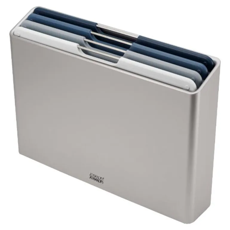 Joseph Joseph sine fargekodede Folio Sky skjærebrett gjør det enkelt å holde både matlagingen og kjøkkenbenken organisert. Dette smarte settet har 4 skjærebrett i ulike farger, samlet i en moderne, sølvfarget beholder.
