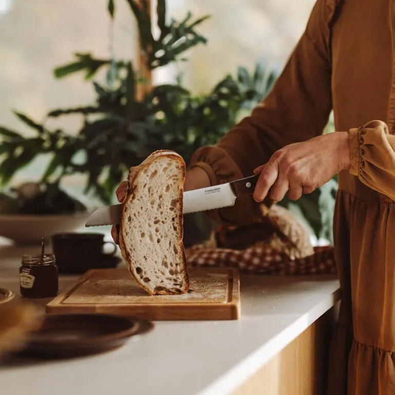 Folken brødkniv 21 cm fra Fiskars kombinerer funksjonalitet og eleganse. Det tyske rustfrie kvalitetsstålet gir en sylskarp egg som skjærer gjennom selv de mest sprø brødskorper med presisjon.