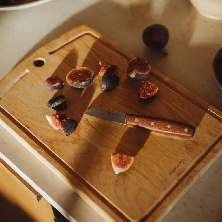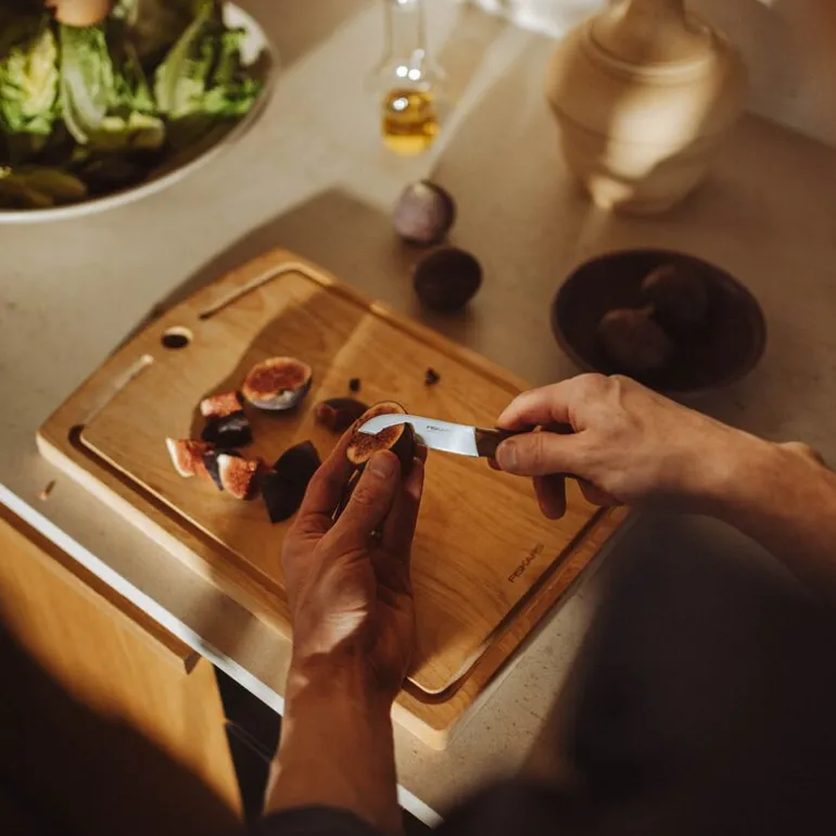 Folken grønnsakskniv 7 cm fra Fiskars er det perfekte redskapet for finjustert kjøkkenarbeid. Det tyske rustfrie kvalitetsstålet gir en sylskarp egg som gjør rensing, skrelling og kutting av små ingredienser til en presis opplevelse.