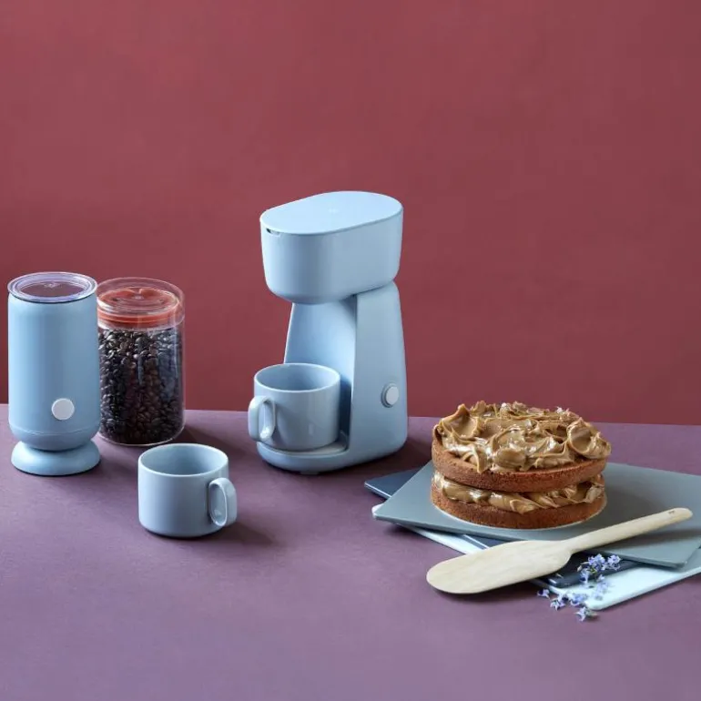 Blå FOODIE single cup kaffemaskin inviterer til daglig bruk med sitt funksjonelle og brukervennlige design. Kaffemaskinen tar minimalt med plass og er perfekt til de som gjerne vil ha en enkel kopp friskbrygget kaffe. Kaffemaskinen kan brygge maks 0,4 liter kaffe under en bryggesyklus, og er derfor perfekt ifølge med feks. Stelton ToGo Click 0,4L termokopp (denne kan kjøpes utenom). Kaffemaskinen er utstyrt med et gjenbrukbart kaffefilter, med hensyn for miljøet. Kaffefilteret kan kjøpes som reservedel, hvis det skulle gå i stykker. Alle el-artiklene i FOODIE-serien kan adskilles, så de rene materialer kan gjenskapes til nye produkter.