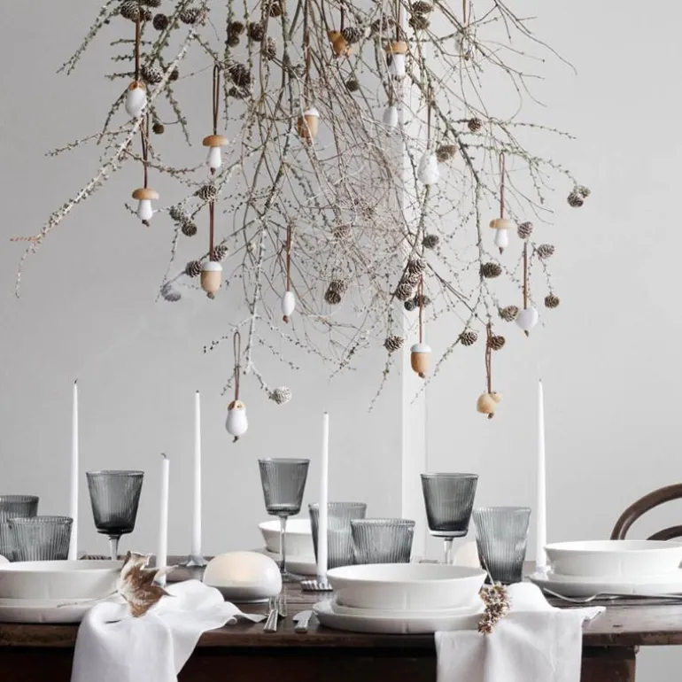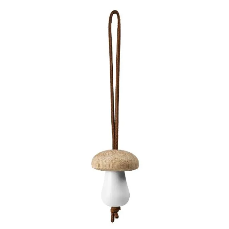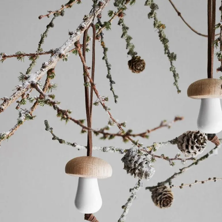 De minimalistiske dekorasjonene inkluderer soppen, som er vakkert laget med en topp i eik, mens den hvite basen i malt tre er designet for å lyse opp som snø. Den vakre, skulpturelle formen er et symbol på både vekst og oppløsning, og markerer vintersolvervet og overgangen fra den lange mørke vinteren til vårens ankomst og lysere dager. I denne skiftende årstiden trekker vi oss gjerne litt tilbake innendørs. Mens vi roer ned i varmen, kan vi se mot juletreet, vinduskarmen, grenene i vasen ? eller hvor som helst du mener soppen bidrar til å skape en naturlig, autentisk og nordisk jul full av kjærlighet og tilstedeværelse.