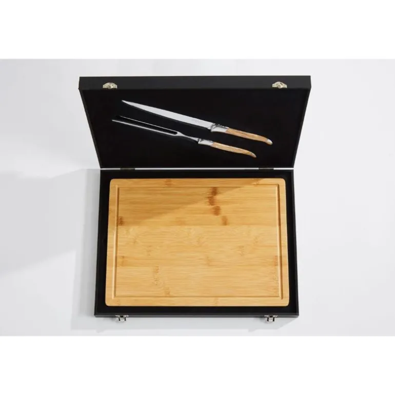 Settet består av en forskjærkniv + stekegaffel. Begge deler er laget av 420 rustfritt stål og er merket med en logo, og har et håndtak av oliventre.