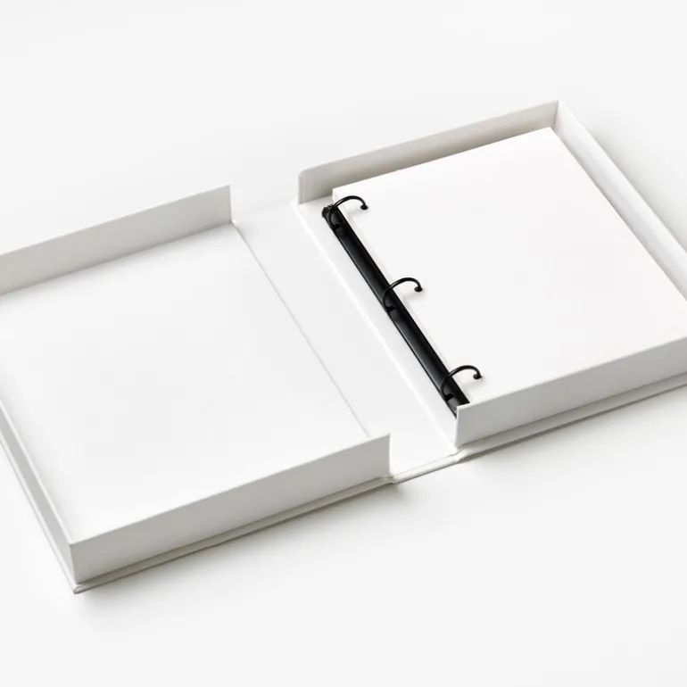 - Cover: 100% Cotton fabric + recycled greyboard. Pages FSC, acid free black card. Black metal binder.