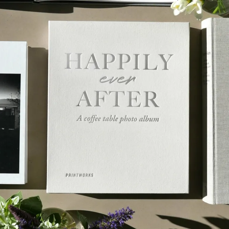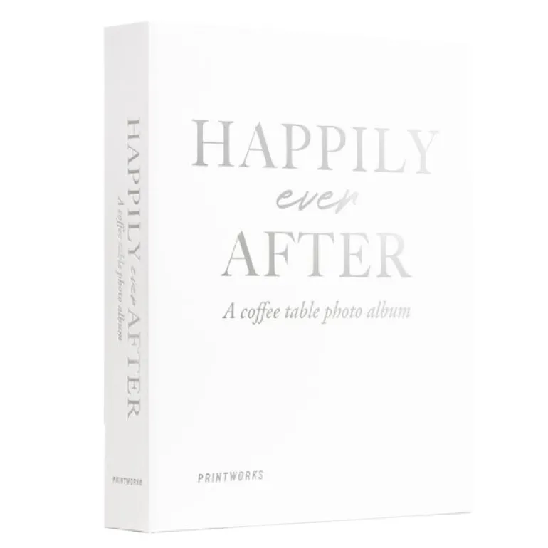 Happily Ever After fotoalbumet er designet for å forevige bryllupsminner på en stilfull og elegant måte. Omslaget i lysegrått stoff med sølvfolietekst gir et raffinert uttrykk som gjør albumet til en naturlig del av hjemmets interiør.