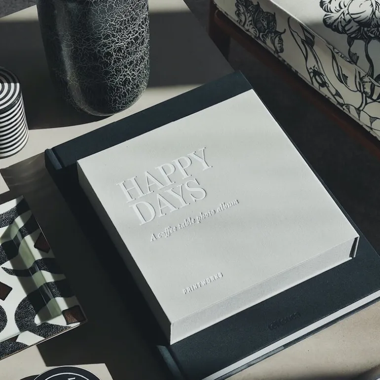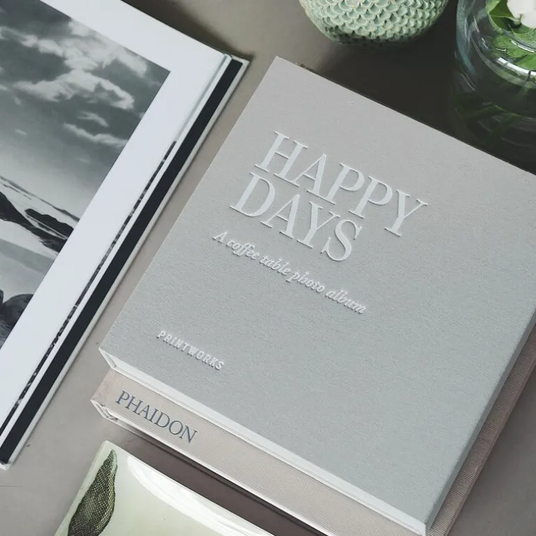 Happy Days Coffee Table Photo Album kombinerer funksjonalitet og stil med sitt lysegrå stoffomslag og hvite tekst. Dette kompakte albumet er ideelt for å bevare spesielle minner på en sofistikert måte.