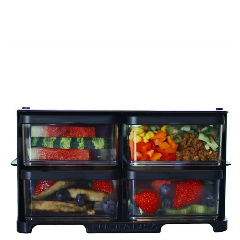 Fresh & Easy Matrack 110 cl i svart er den ideelle løsningen for organisert og enkel matoppbevaring i kjøleskapet. Med et stilrent design og fire praktiske bokser hjelper dette matstativet deg med å holde orden på alt fra pålegg og frukt til middagsrester. Ved å bruke Fresh & Easy Matrack kan du bevare matens friskhet lenger, redusere matsvinn og ha full oversikt over innholdet takket være det smarte datomerkingssystemet som er integrert på undersiden av boksene.