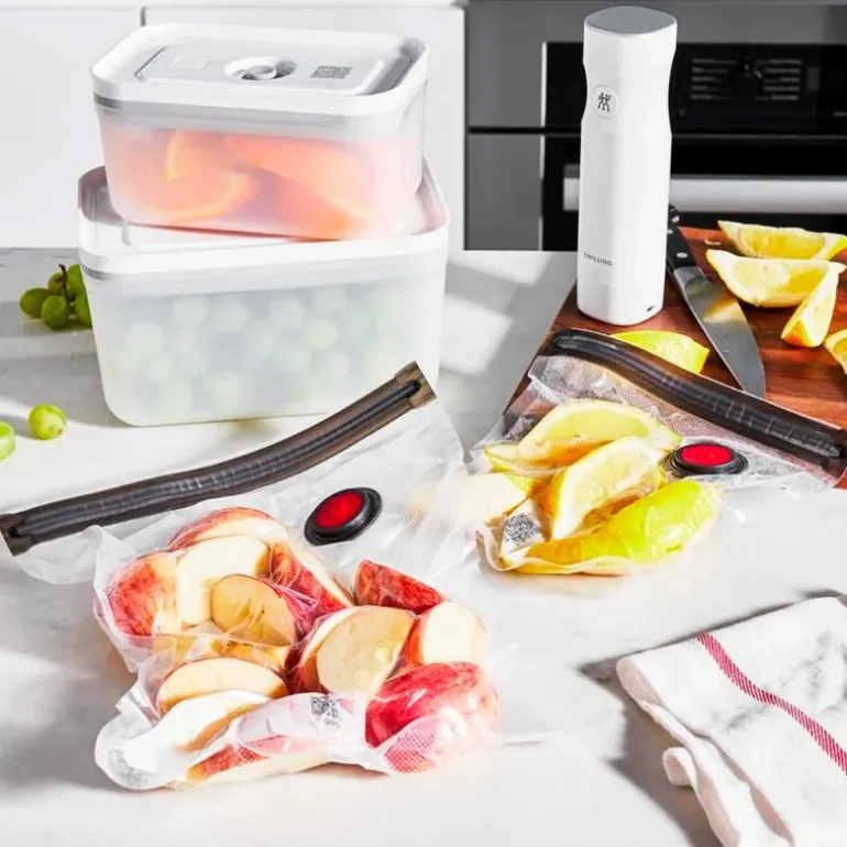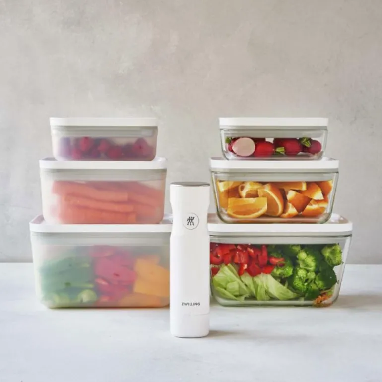 Maten holder seg fersk opptil 5 ganger lenger sammenlignet med ikke-vakuumpakket mat. Smaken og næringsstoffene bevares lenger og det blir mindre matsvinn. Startsett med både pumpe, poser & 3 forskjellige størrelser bokser. Formene er laget av slitesterk lettvekts plast og kan brukes i mikrobølgeovn (med lokk uten vakuum). Boksene kan deretter oppbevares i kjøleskap eller fryser (vakuum unngår fryseforbrenning). Alle oppbevaringsdeler kan vaskes i maskin.
