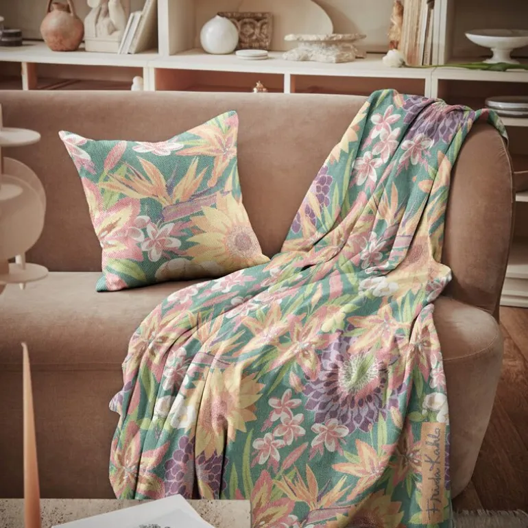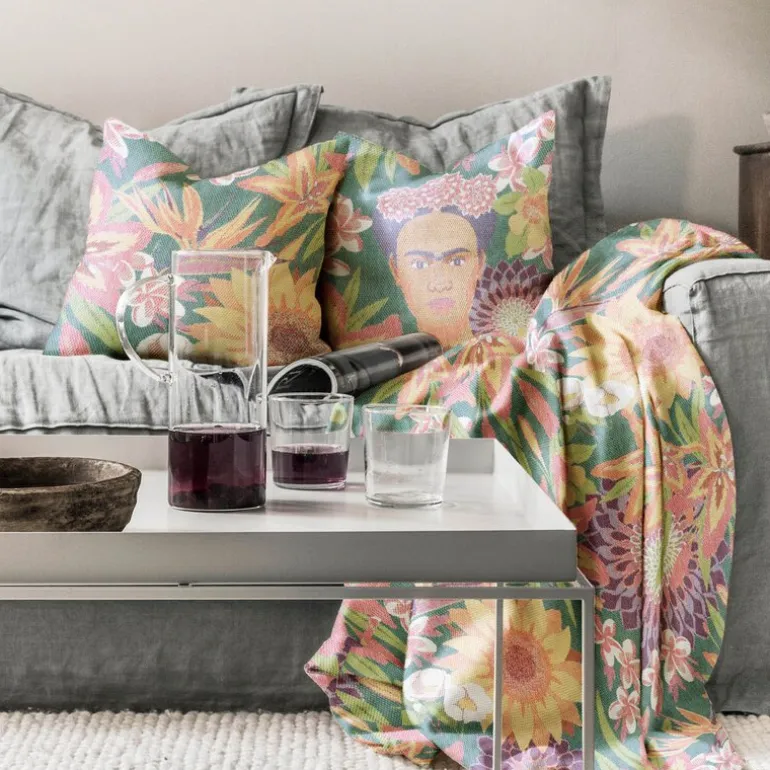 Frida Kahlo Flores pledd fra Ekelund kombinerer myk komfort med kunstnerisk uttrykk. Designet er inspirert av Frida Kahlos livlige stil og gir pleddet en sterk visuell identitet. Med sine mål på 140×170 cm passer det utmerket i sofaen, på sengen eller som et koselig tilskudd i utemøblene på varme kvelder. Den børstede overflaten gjør det ekstra mykt og behagelig.