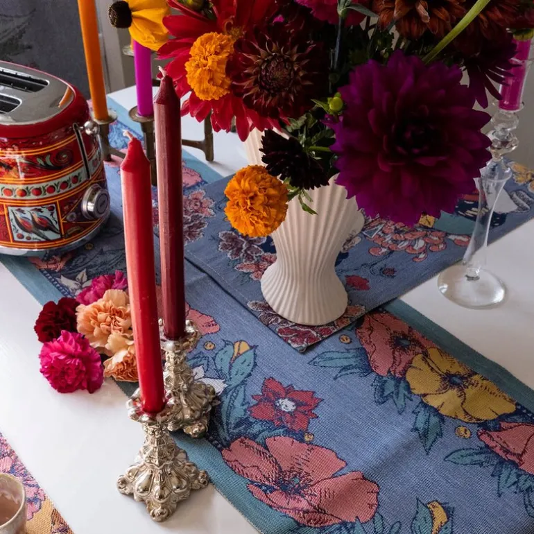 Frida Kahlo Vida løper fra Ekelund er en dekorativ og kunstnerisk tekstil som gir borddekkingen et fargerikt og personlig uttrykk. Med inspirasjon hentet fra Frida Kahlos unike stil, tilfører løperen både karakter og varme til rommet. Den måler 35×120 cm og kan brukes på tvers eller langs bordet, enten alene eller over en duk for mer dybde.