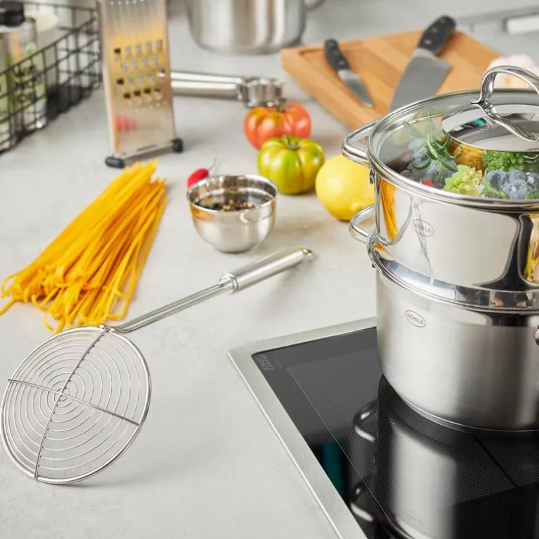Trådskje for frityrstekt mat med bred avstand mellom trådene, som sikrer rask og effektiv drenering av matolje. Tåler oppvaskmaskin.