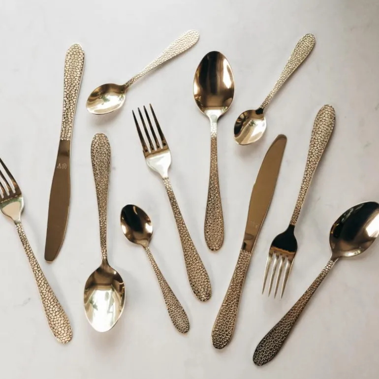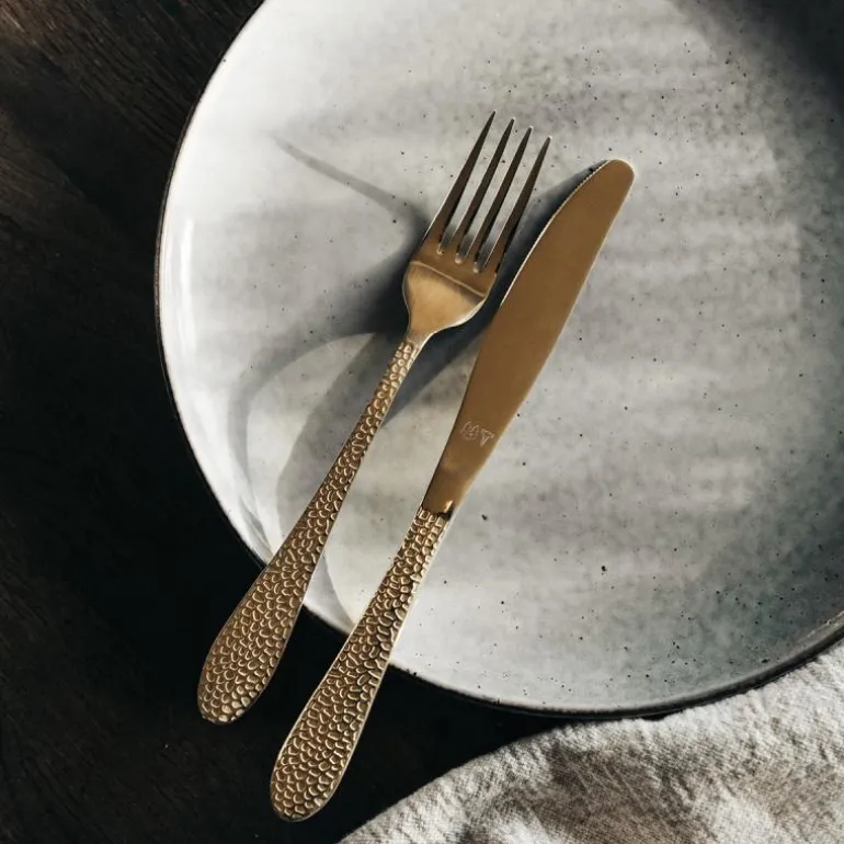 Frost Aura bestikksett 16 deler gull fra Vargen & Thor. Ta dine spisemiddager til et nytt nivå av eleganse med AURA Bestikksett 16-deler i Cava – det ultimate valget for de som ønsker å skape en sofistikert og fortryllende atmosfære ved bordet!