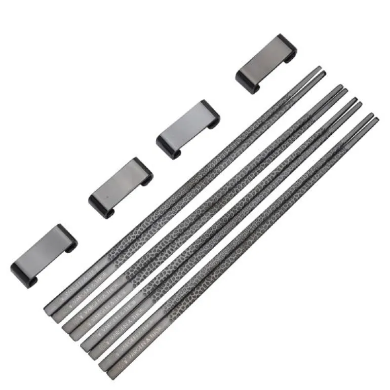 Spisepinnene har en unik hamret overflate, fin gravering, og hvert sett kommer med 4 par spisepinner, samt 4 matchende stativer.