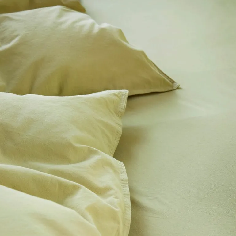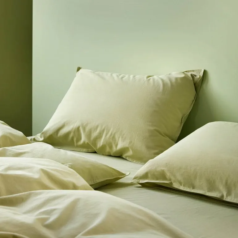 Frøya sengetøy 140×220 cm dempet lime fra Høie. Frøya sengesett i steinvasket bomull kombinerer komfort med et avslappet, stilrent uttrykk. Laget av 100 % økologisk bomull, er dette sengetøyet designet for å gi en behagelig og myk følelse mot huden, samtidig som de ekstra fine bomullstrådene sikrer høy slitestyrke. Den steinvaskede finishen gir en naturlig tekstur og et uanstrengt, krøllete utseende som tilfører sengen en avslappet eleganse.
