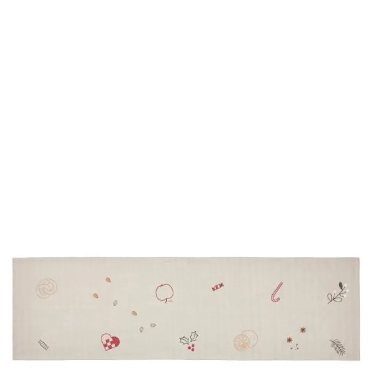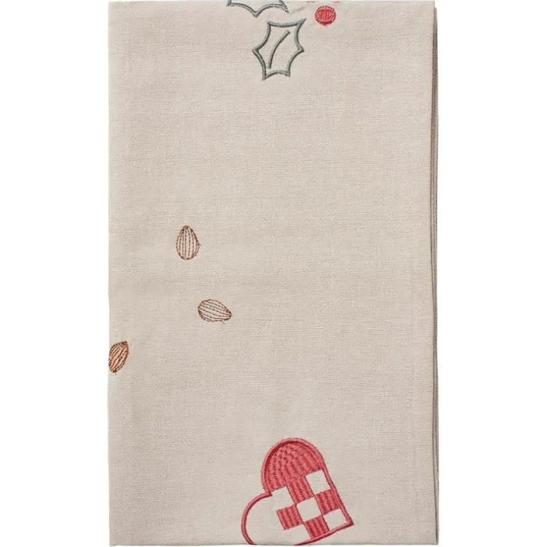 Dekorativ bordløper, Fryd 40×140 cm i lys varmgrå med rødt broderi, fra Broste Copenhagen. Serien Fryd er et veldig koselig innslag i det julepyntede hjem og veldig koselig å ta frem igjen år etter år. Serien finnes i 2 farger og består av lække servietter og løpere. Serveittene ligger i 2 stk. pakker, imens løperne kjøpes enkeltvis. Serien er fremstillet i en kraftig 100% Bomuld med broderte julemotiver.