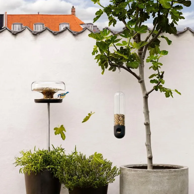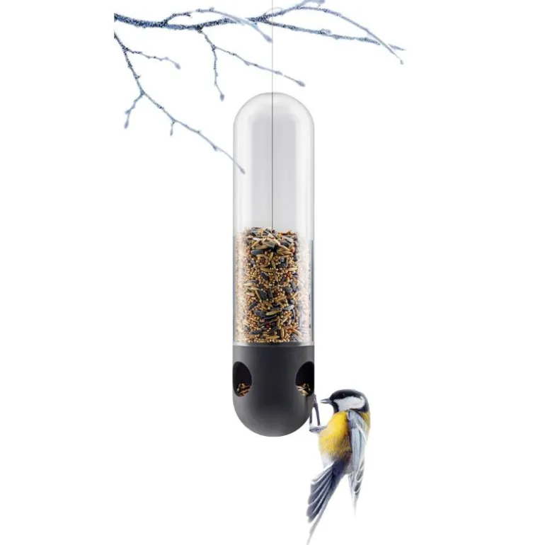 Eva Solo fuglemater henges opp i et tre eller en busk med den medfølgende strengen. Fuglemateren sørger for at småfuglene får rikelig med frø. De små åpningene nederst i fuglemateren gjør det lett for småfuglene å gripe tak i røret og spise. Det gjennomsiktige røret med en kapasitet på 650 ml viser når det er tid for påfyll av fuglefrø. Rørets to deler er enkle å ta fra hverandre, og begge tåler oppvaskmaskin.