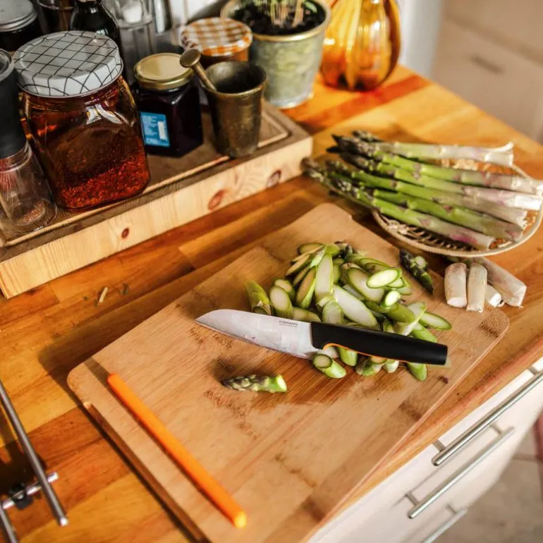 For hjemmekokker som setter pris på enkle og smarte kjøkkenredskaper er Fiskars Functional Form? Liten Kokkekniv en smart liten kniv man bør ha på kjøkkenet. Det holdbare bladet i japansk rustfritt stål passer for en mengde mindre oppgaver på kjøkkenet. Det ergonomiske håndtaket har SoftGrip? detaljer og en dyp fingerhake, noe som sikrer en god ergonomi og ikke minst ivaretar sikkerheten. Som alle Functional Form? kniver, kan også denne vaskes i oppvaskmaskinen. Designet i Finland.