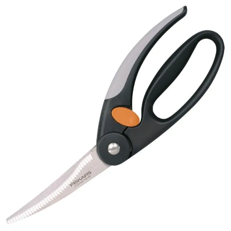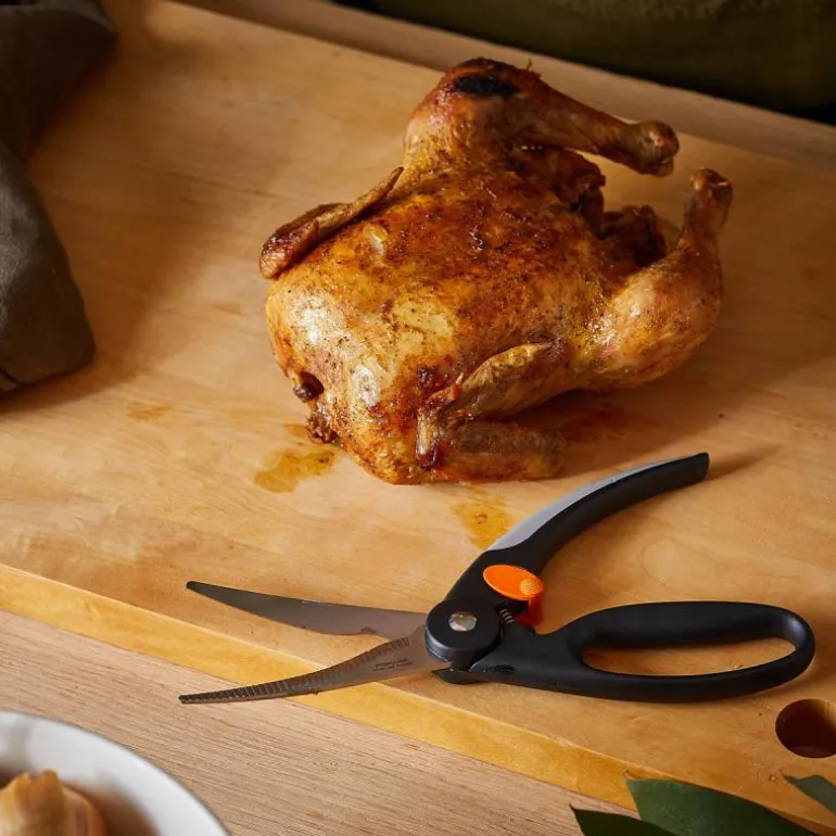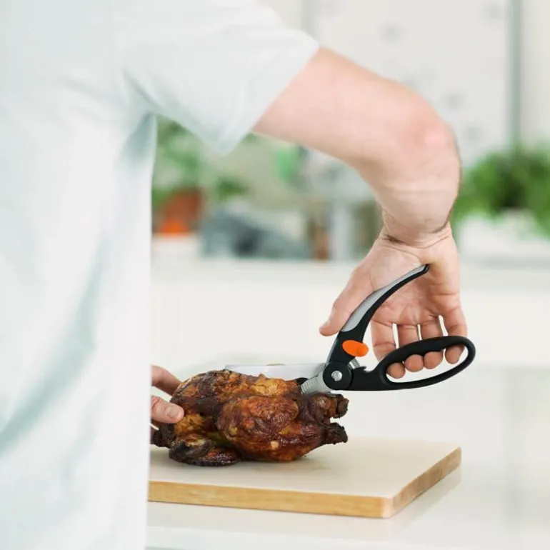 Functional Form kyllingsaks, med sterke skjær til flåing, klipping og oppdeling av kylling og annet fjærkre.De bøyde, profilerte bladene letter klippingen. Blader med riller til klipping av ben. Soft-grip håndtakene passer både høyre- og venstrehendte.Fingerbøyle-håndtak. Tommelfingerbetjent låsemekanisme. Tåler oppvaskmaskin. I rustfritt stål med hardhet HRC 57. 200gr. 25 cm lang