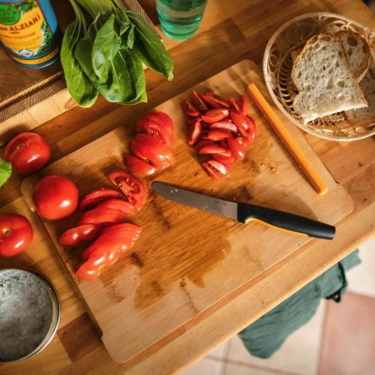 For hjemmekokker som setter pris på enkle og smarte kjøkkenredskaper er Fiskars Functional Form? Tomatkniv en kniv man fort blir glad i. Det holdbare, serraterte bladet i japansk rustfritt stål er ideelt for skjæring av alle grønnsaker med skall slik som tomater, men fungerer også som en biffkniv. . Det ergonomiske håndtaket har SoftGrip? detaljer og en dyp fingerhake, noe som sikrer en god ergonomi og ikke minst ivaretar sikkerheten. Som alle Functional Form? kniver, kan også denne vaskes i oppvaskmaskinen. Designet i Finland.