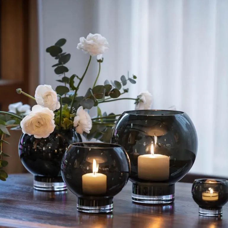 GALAXIE er raus og myk i formene, og kommer i tre funksjonelle størrelser i gjennomfarget koksgrått glass: Telykt/vase liten H 8,5 cm, lykt/vase medium H 16,5 cm og lykt/vase stor H 23 cm. Serien er munnblåst og håndlaget av yrkesstolte glassblåsere, og er laget for deg som liker det funksjonelle og estetisk vakre. Det handler om å skape god stemning, enten med levende lys eller friske blomster.