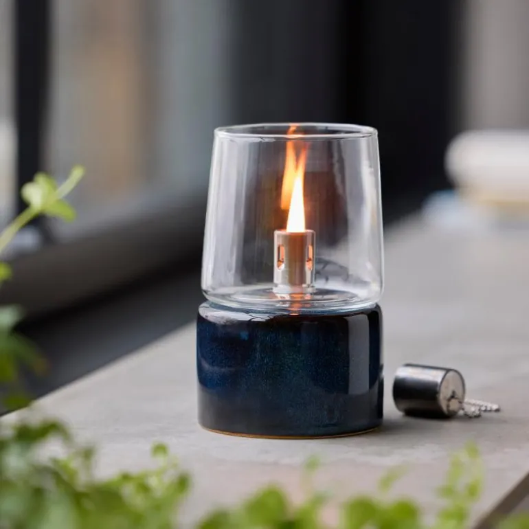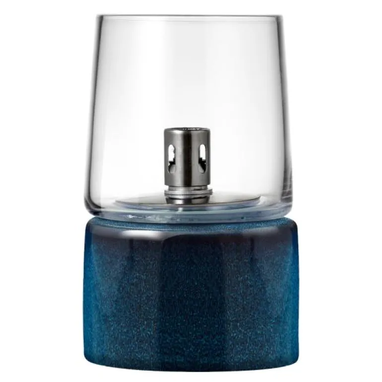Gastro oljelampe 8,5 x 14 cm blå, fra Bitz. Hva er det ikke å elske med denne koselige oljelampen i steintøy og glass? Plasser den på spisebordet, i vinduskarmen eller i hyggekroken, tenn et lite stearinlys og nyt den. Lampen har en sokkel i glasert steintøy og en brenner i rustfritt stål med veke. Oljelampen fås i to størrelser og fire av de vakre fargene vi allerede kjenner fra BITZ’ steintøykolleksjon, og derfor er det så enkelt og opplagt å integrere oljelampen i både borddekkingen og den øvrige innredningen.