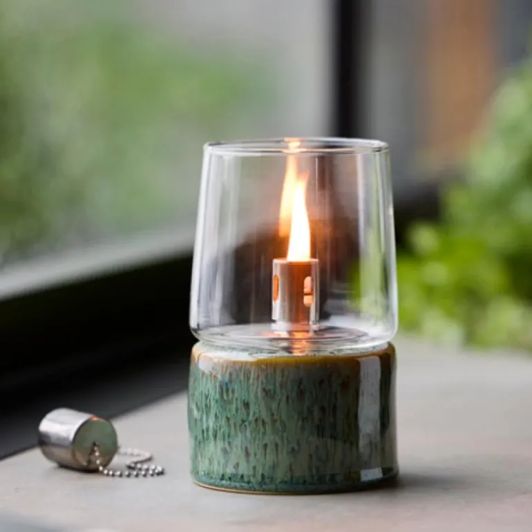 Gastro oljelampe 8,5 x 14 cm grønn, fra Bitz. Hva er det ikke å elske med denne koselige oljelampen i steintøy og glass? Plasser den på spisebordet, i vinduskarmen eller i hyggekroken, tenn et lite stearinlys og nyt den. Lampen har en sokkel i glasert steintøy og en brenner i rustfritt stål med veke. Oljelampen fås i to størrelser og fire av de vakre fargene vi allerede kjenner fra BITZ’ steintøykolleksjon, og derfor er det så enkelt og opplagt å integrere oljelampen i både borddekkingen og den øvrige innredningen.