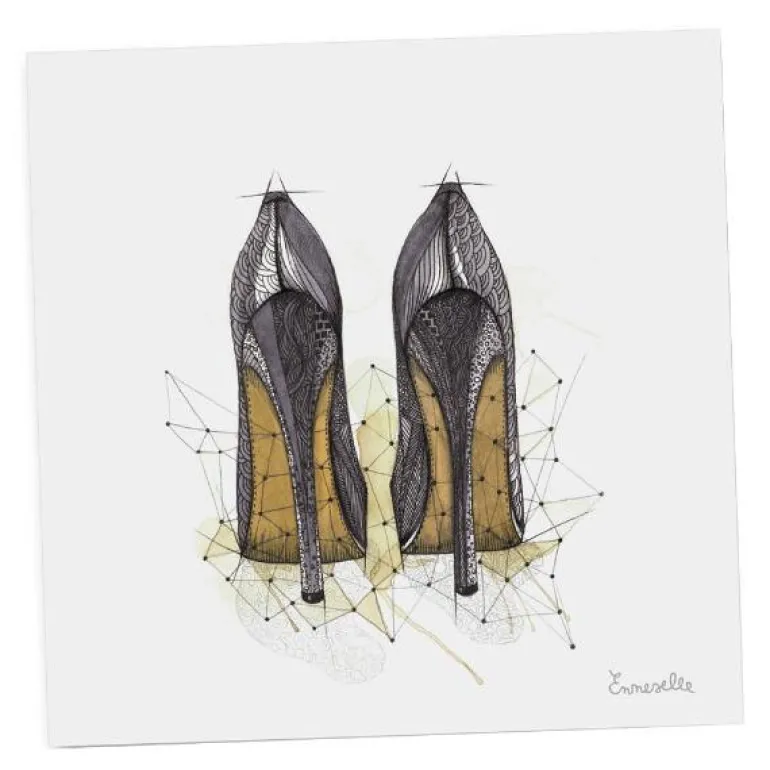 Fin gavelapp fra Emmeselle med motiv av damesko. Motivet er etter tegninger fra kunstner og illustratør Mona Stenseth Erlandesn.