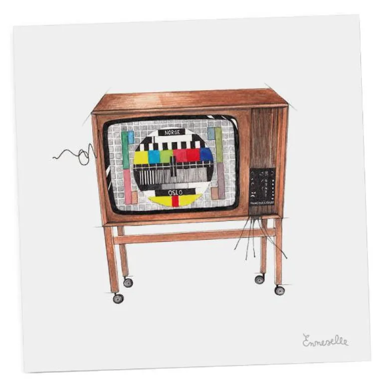 Fin gavelapp fra Emmeselle med motiv av fargefjernsyn. Motivet er etter tegninger fra kunstner og illustratør Mona Stenseth Erlandesn.