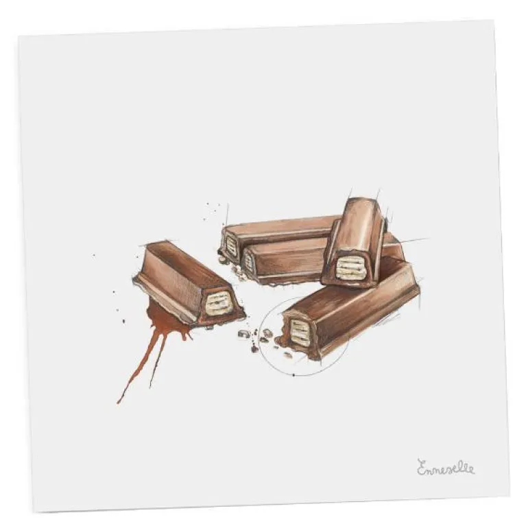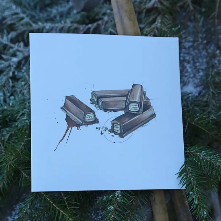 Fin gavelapp fra Emmeselle med motiv av sjokolade. Motivet er etter tegninger fra kunstner og illustratør Mona Stenseth Erlandesn.