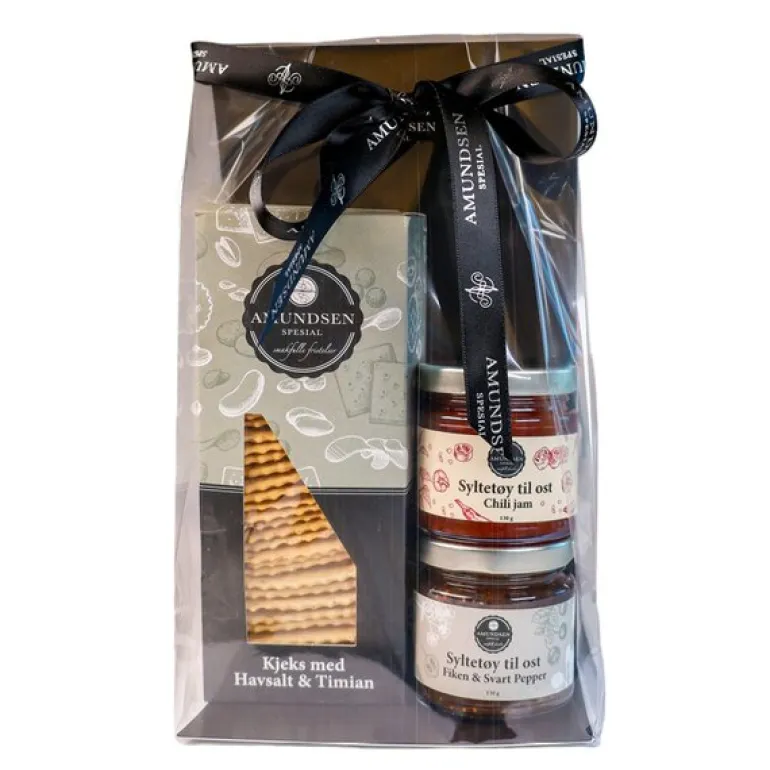 - Kjeks: HVETEMEL, Havsalt m/jod, Rapsolje, vann, timian, 130g. Syltetøy til ost – Fiken & Svart Pepper: Sukker, fiken (43%), eplejuice, fortykningsmiddel: pektin, svart pepper (0,50%), sitronjuice, 130g. Syltetøy til ost – Chili Jam: Sukker, paprika, jalapeno, eddik,